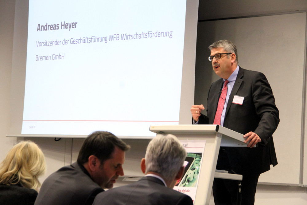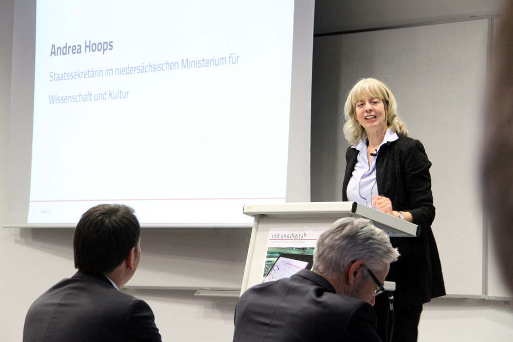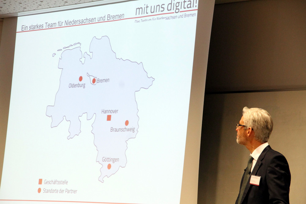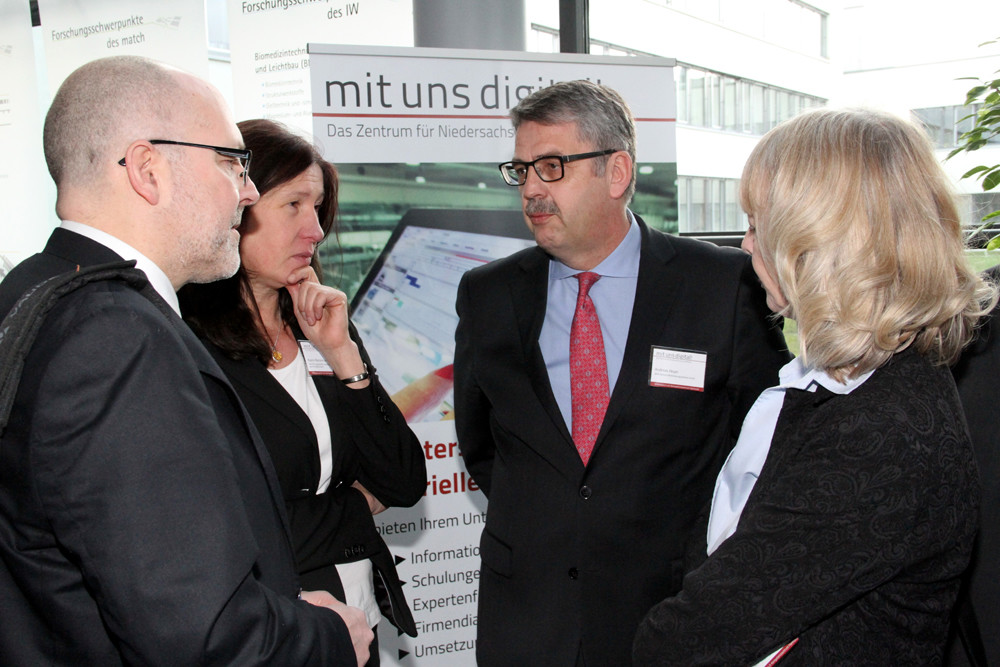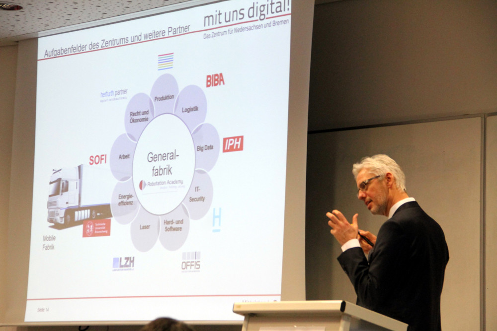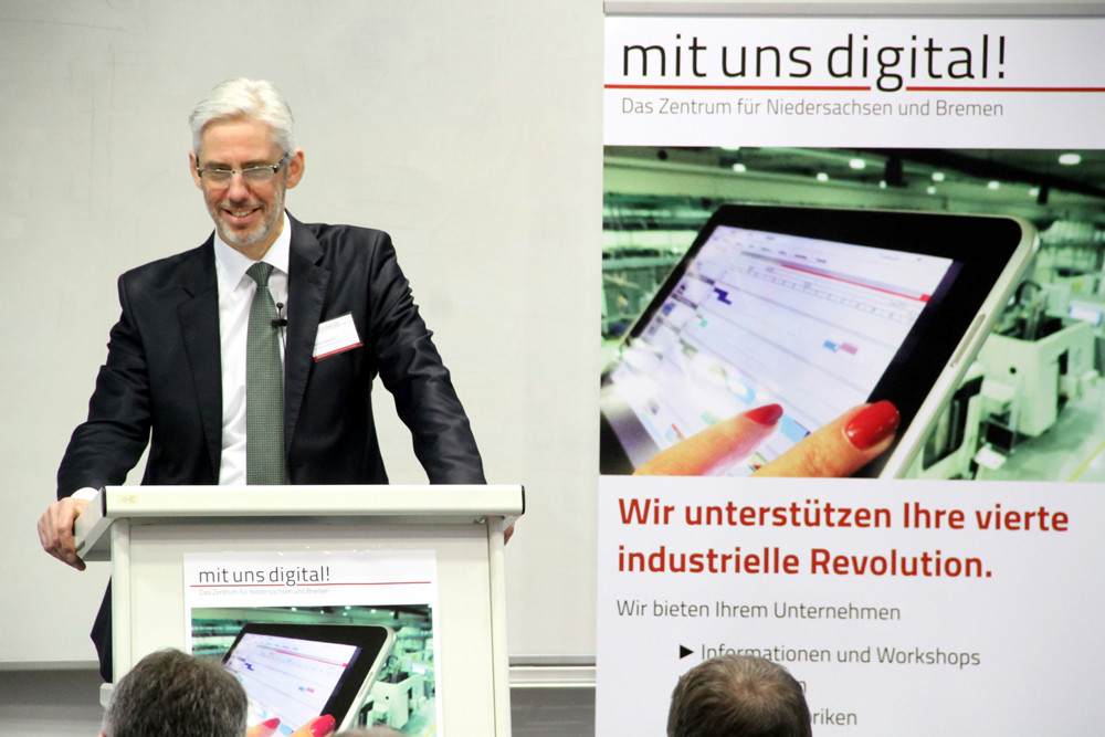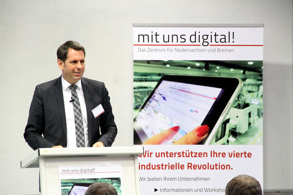 „Mit uns digital! Das Zentrum für Niedersachsen und Bremen“ hat als bundesweit erstes Kompetenzzentrum im Rahmen der Initiative „Mittelstand 4.0“ des Bundesministeriums für Wirtschaft und Energie seine Arbeit aufgenommen. Am Produktionstechnischen Zentrum der Leibniz Universität Hannover in Garbsen gaben 160 Gäste des Startschuss für die auf drei Jahre mit insgesamt 5,4 Millionen Euro geförderte Einrichtung. Ihr Ziel ist es, Industrie-4.0-Know-how in den Mittelstand zu bringen und damit insbesondere kleine und mittlere Unternehmen in ihrer Wettbewerbsfähigkeit zu stärken. Fast 500 Informationsgespräche bei Unternehmen, rund 250 Schulungen und etwa 70 Workshops in ganz Niedersachsen und Bremen will das Zentrum dazu bis Ende 2018 realisieren.